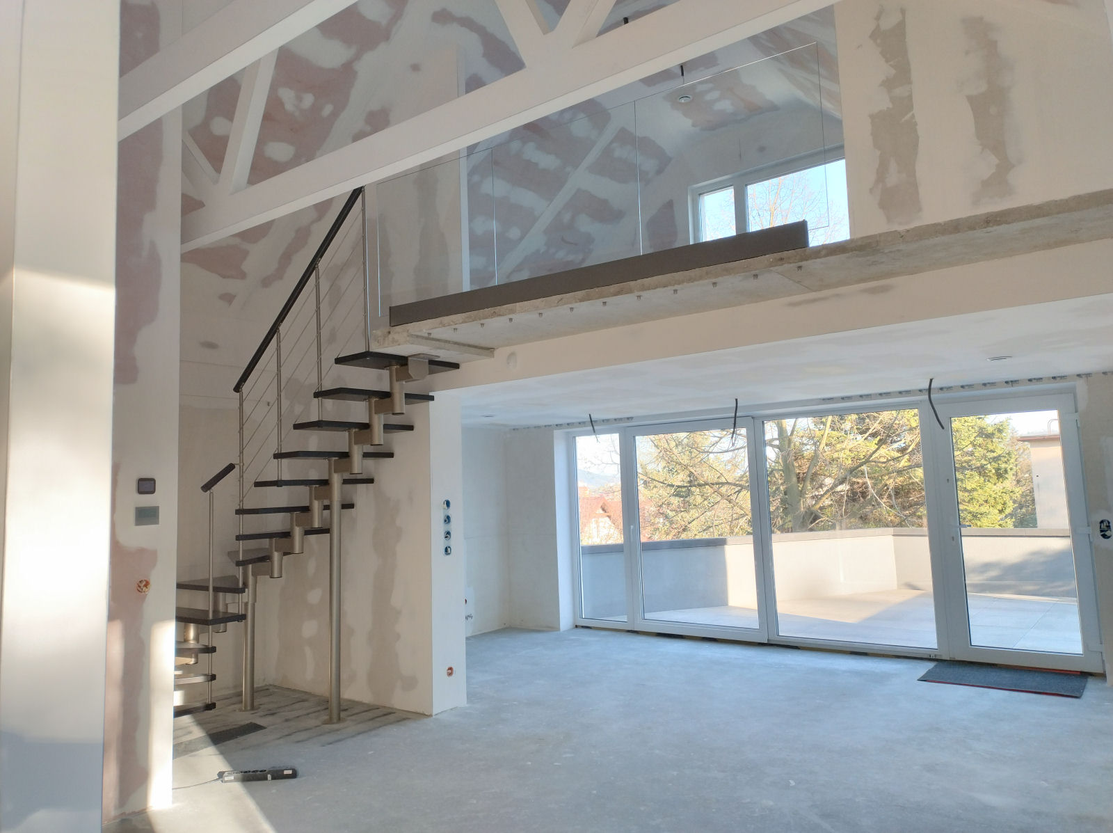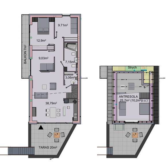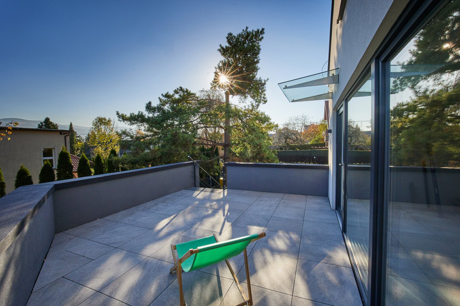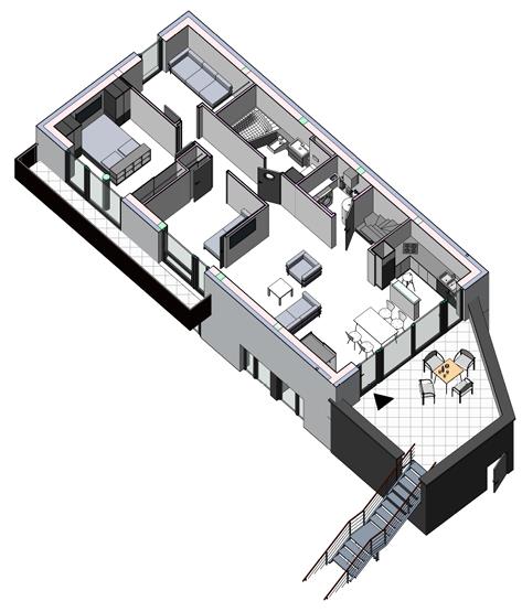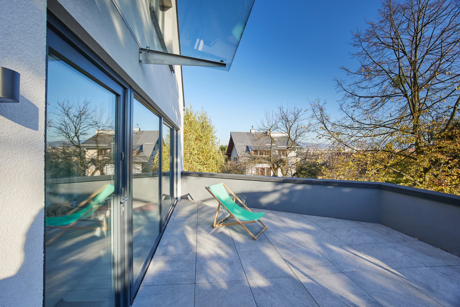 Apartament na piętrze to atrakcyjny penthouse, który otwiera się poprzez szklaną ścianę na kameralny taras otoczony wierzchołkami drzew, z nad których rozpościera się widok na góry, stwarzając intymną przestrzeń połączoną z wnętrzem salonu i kuchni. Widoczna w części dziennej dwukondygnacyjność z elementami dźwigarów i schodami prowadzącymi na widokową antresolę buduje niepowtarzalną przestrzeń tej części. Antresola z pięknym widokiem na miasto i góry może być zarówno uzupełnieniem strefy dziennej jak i odrębnym pokojem. Do apartamentu prowadzą pod „zadaszeniem” sosny zewnętrzne ażurowe schody wychodzące na taras obramowany ściankami attykowymi izolującymi jego przestrzeń przed wzrokiem sąsiadów. Schodami można zejść do własnego ogrodu pod lipą.