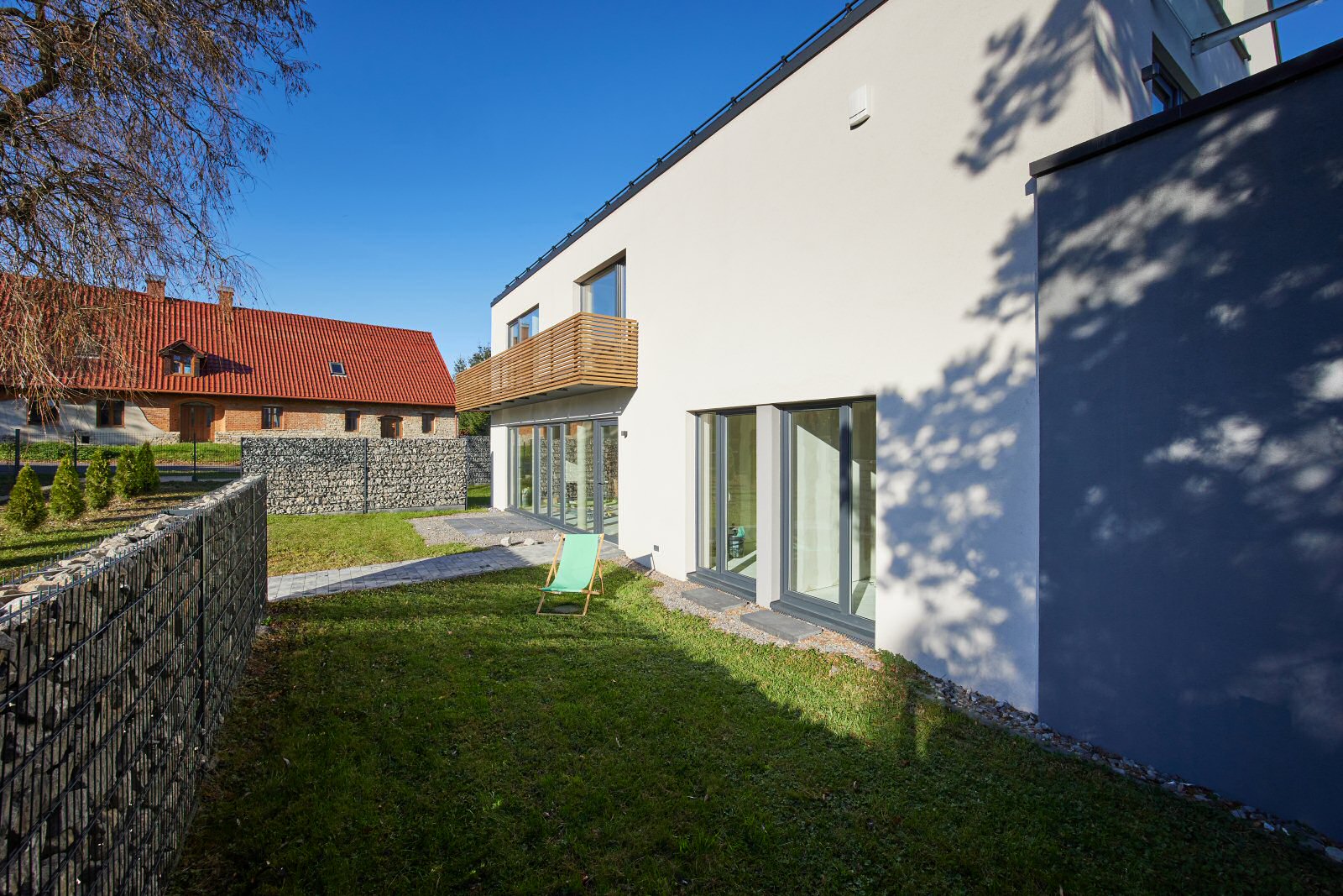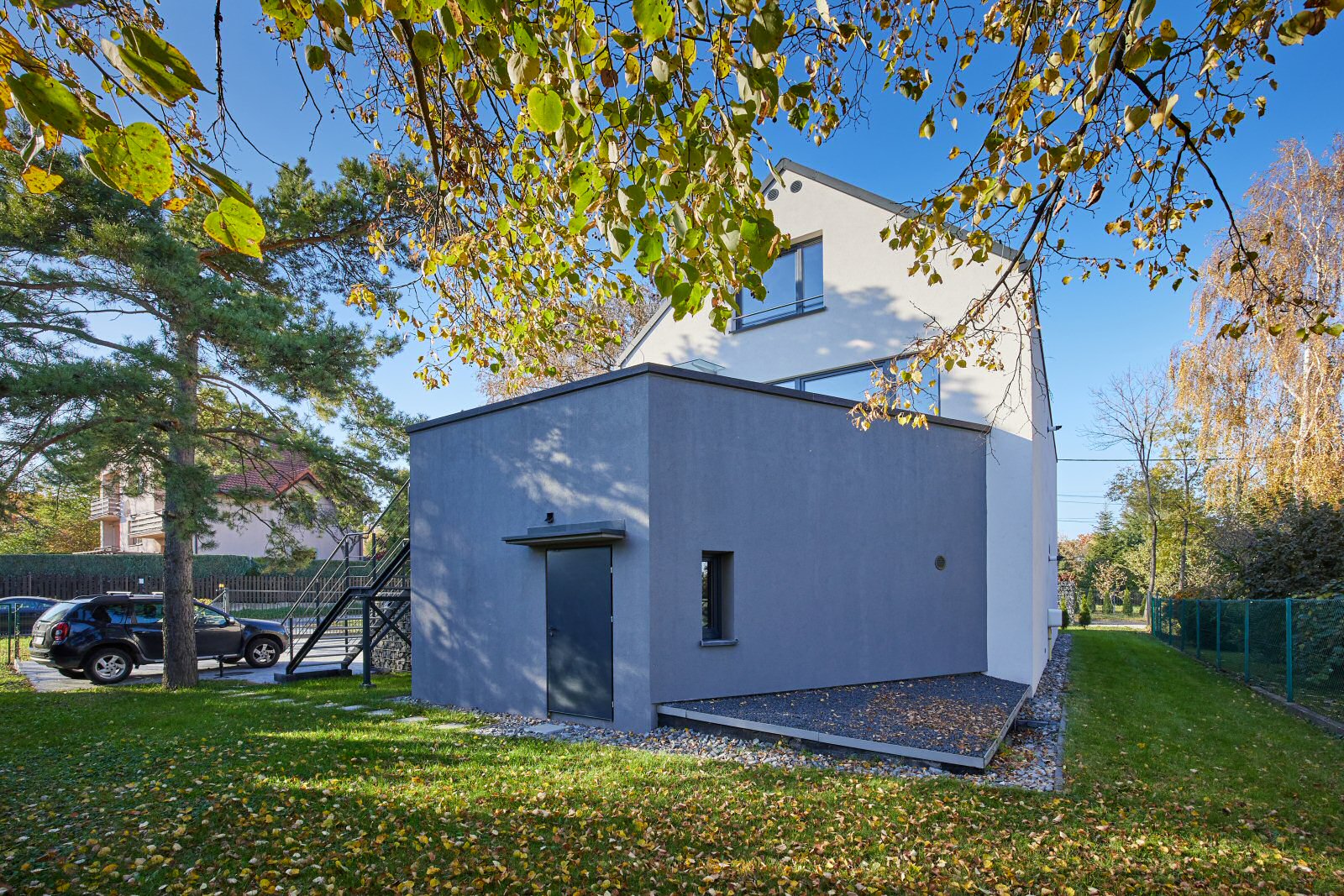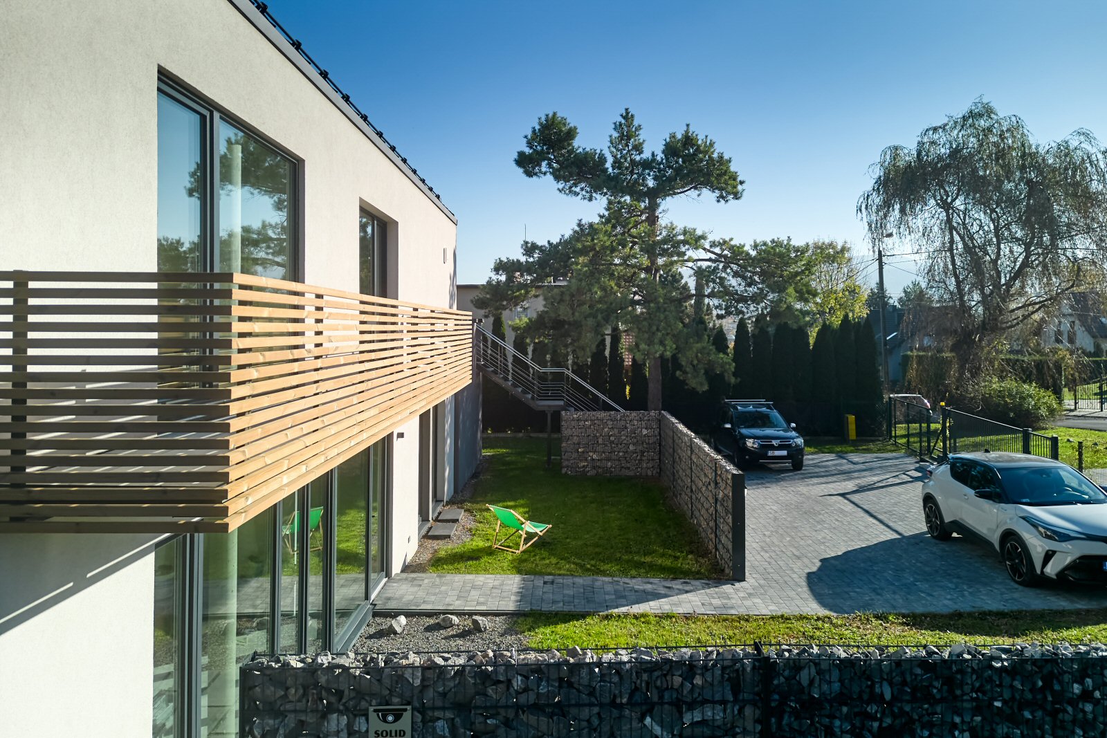 Zwarta bryła kryje dwa całkowicie różne apartamenty na parterze i piętrze budynku. Zaprojektowane w stylu loftowym części dzienne apartamentów cechują się adaptacyjnością przestrzeni do różnorodnych potrzeb. Wyraźnie oddzieliliśmy strefy dzienną i nocną zapewniając komfort zarówno odpoczywającym jak i aktywnym. Naturalne oświetlenie dużych przeszkleń otwartych na części ogrodowo-tarasowe od południowego-zachodu, powiększa przestrzeń mieszkalną integrując ją z zachowaną zielenią. Starannie zaprojektowane zagospodarowanie działki z elementami kamiennych gabionów buduje intymną przestrzeń wydzielonych stref zieleni. Każdy apartament ma swój niezależny ogród i 2 miejsca parkingowe.