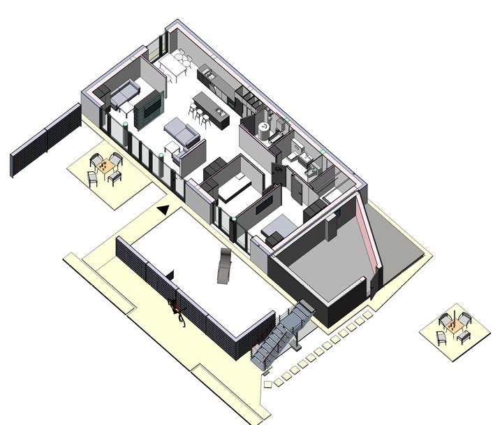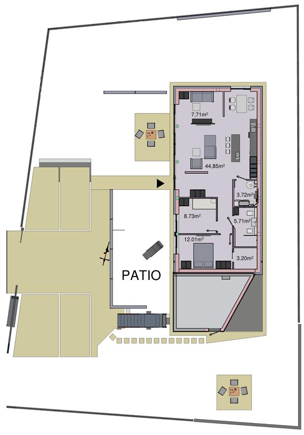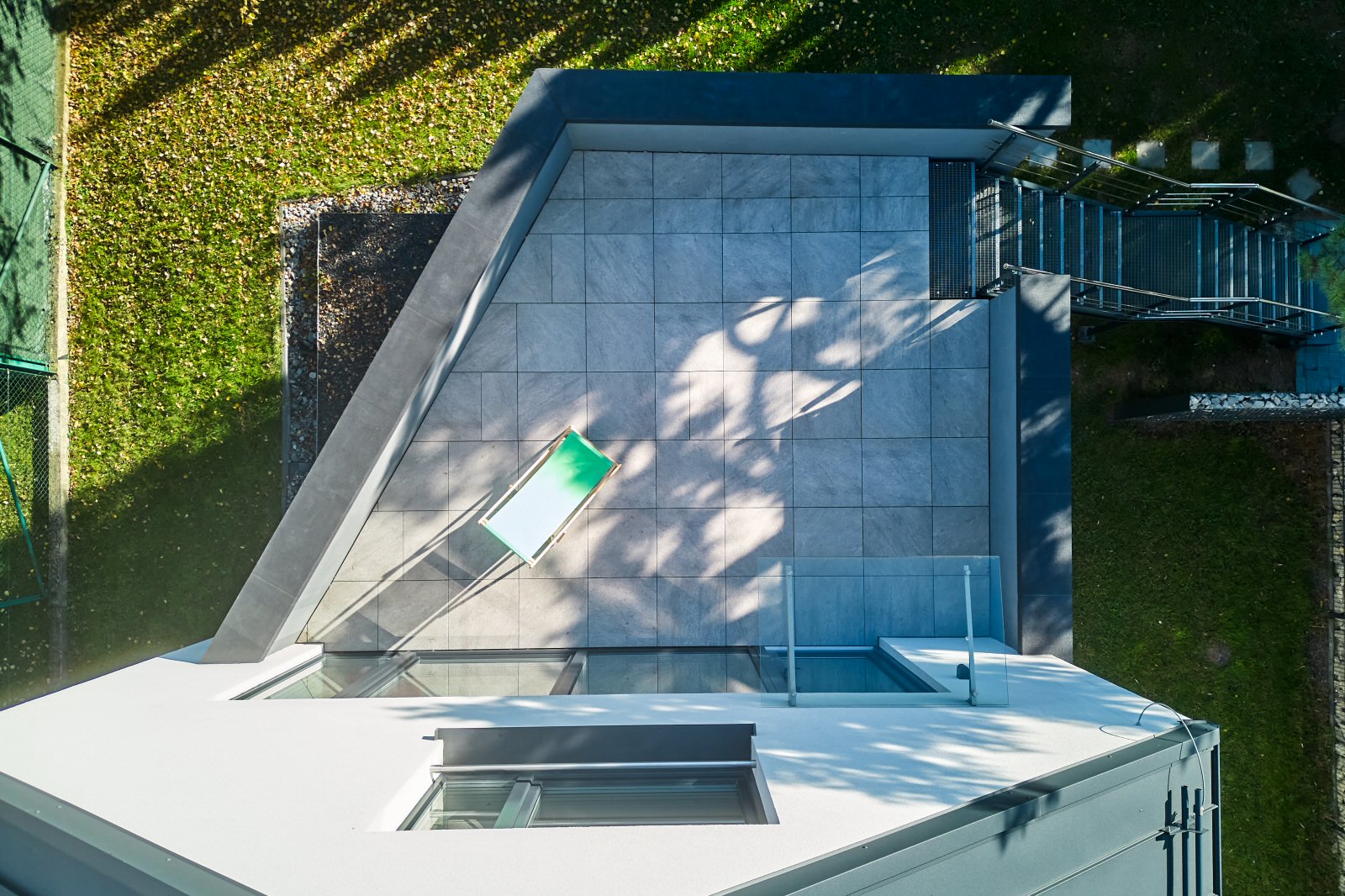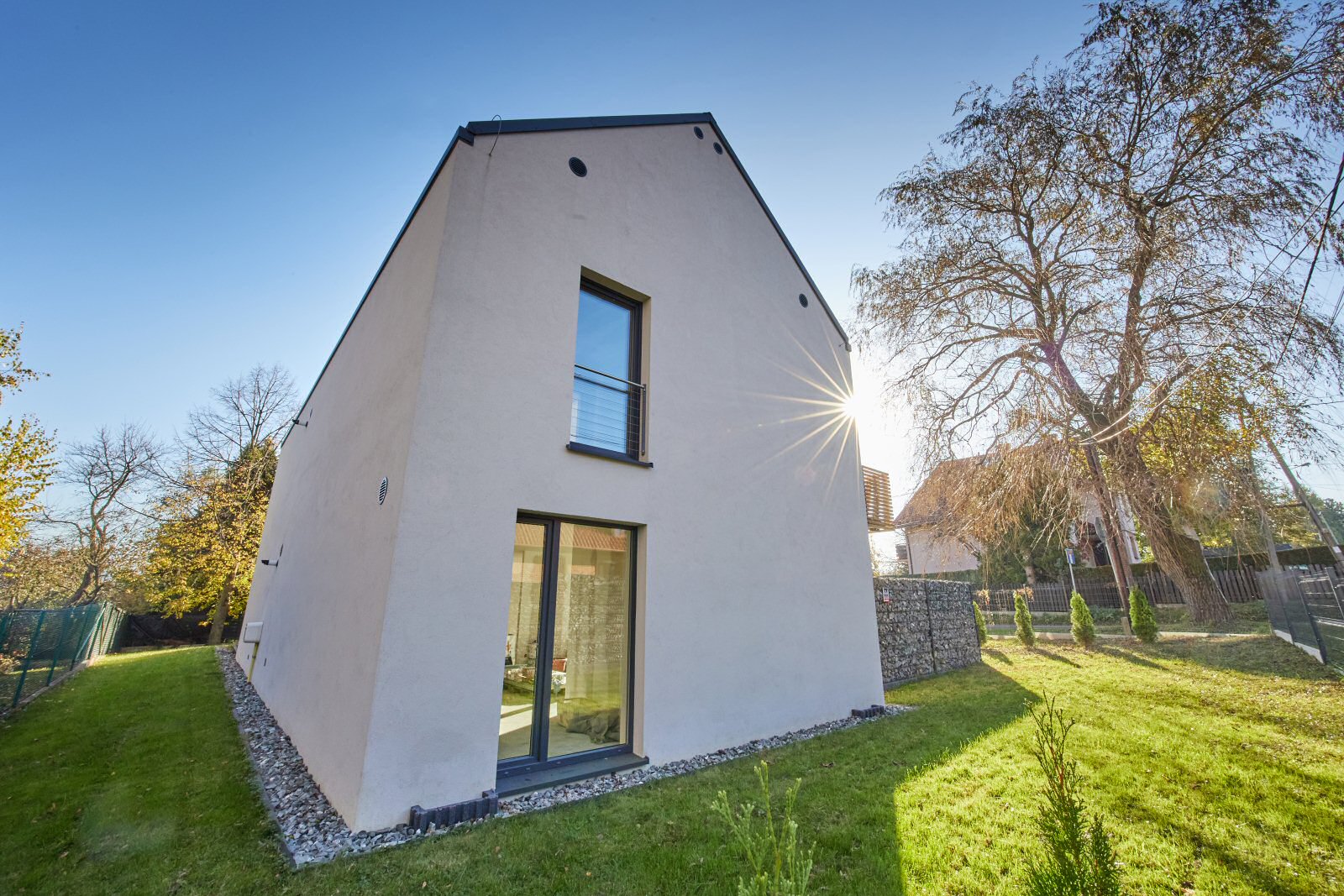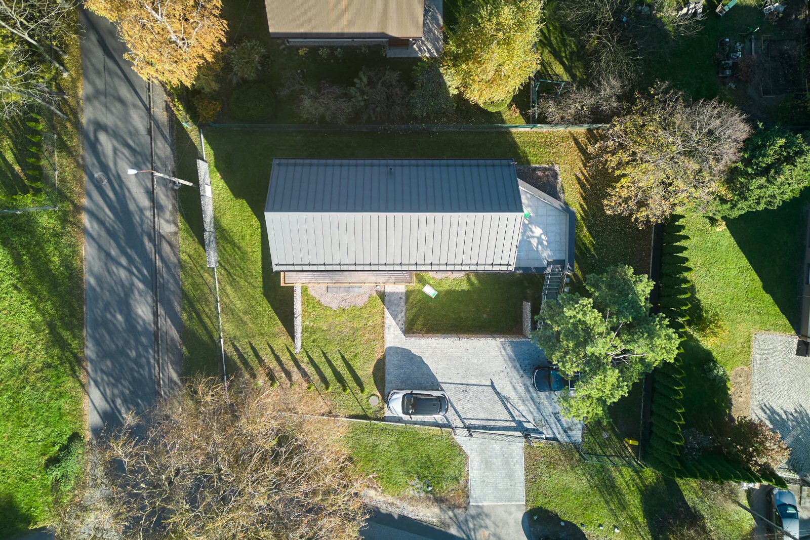 Zwarta bryła kryje dwa całkowicie różne apartamenty na parterze i piętrze budynku. Zaprojektowane w stylu loftowym części dzienne apartamentów cechują się adaptacyjnością przestrzeni do różnorodnych potrzeb. Wyraźnie oddzieliliśmy strefy dzienną i nocną zapewniając komfort zarówno odpoczywającym jak i aktywnym. Naturalne oświetlenie dużych przeszkleń otwartych na części ogrodowo-tarasowe od południowego-zachodu, powiększa przestrzeń mieszkalną integrując ją z zachowaną zielenią. Starannie zaprojektowane zagospodarowanie działki z elementami kamiennych gabionów buduje intymną przestrzeń wydzielonych stref zieleni. Każdy apartament ma swój niezależny ogród i 2 miejsca parkingowe.